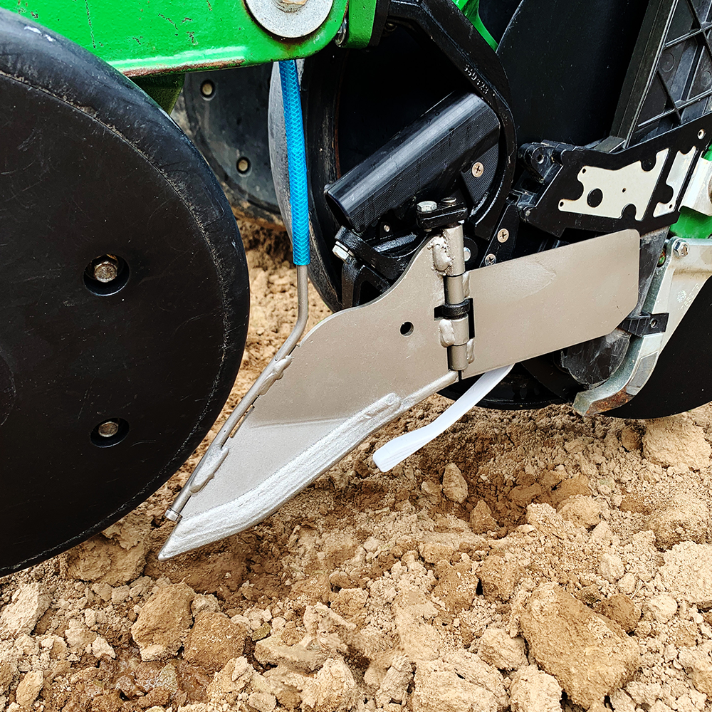 The 360 WAVE mounts to the rear of the planter row-unit shank. This simplifies installation and ensures alignment with the double-disk openers. The 360 WAVE blade swivels to follow the seed trench on curves but includes a stop to limit travel so the blade never places starter in the seed trench. The blade is spring loaded so that it can react to rocks and obstructions without becoming bent or misaligned.
